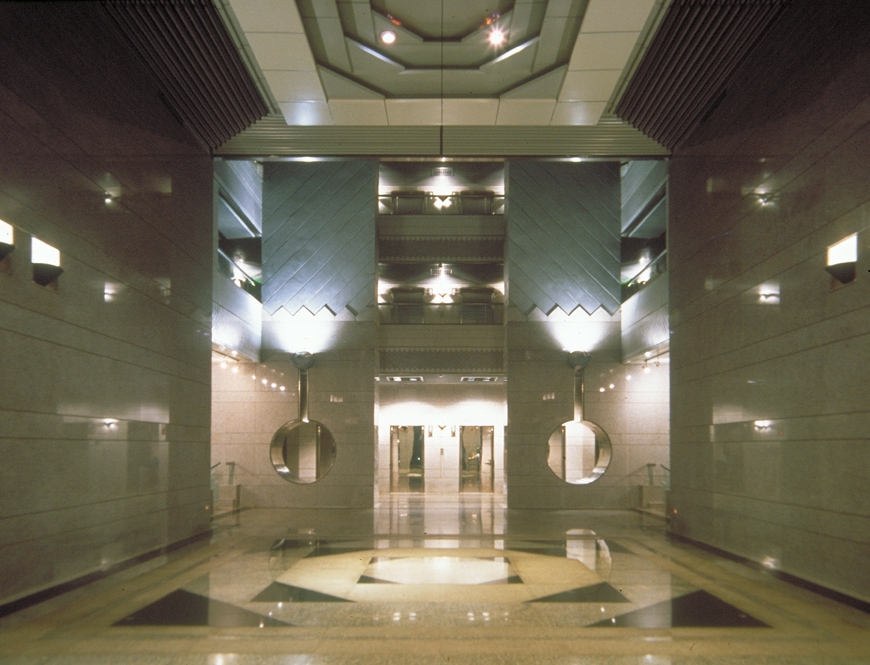大樓外牆全部採用鋁帷幕,並有金屬圓形曲線。室內中庭採灰色磁磚,以配合大樓銀灰色金屬的材質。大廳的牆與地板都採用花崗岩,讓大廳看來有冷凝、安靜的氣氛,讓每個進入辦公室的人都先具備心平氣和的情緒。